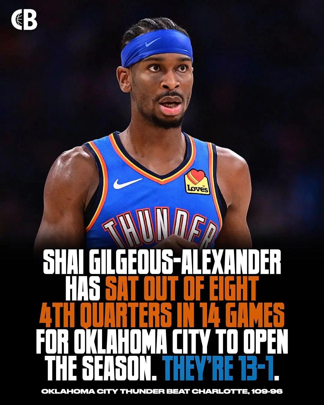 这样一来,在开季拿下8连胜后,雷霆队又拿下5连胜,开季前14场比赛拿到13胜1负傲人表现,继续以绝对优势领跑排行榜,期间唯一输掉的一场比赛是背靠背第二场因为体能问题2分惜败给强调快速攻防转换节奏的开拓者。