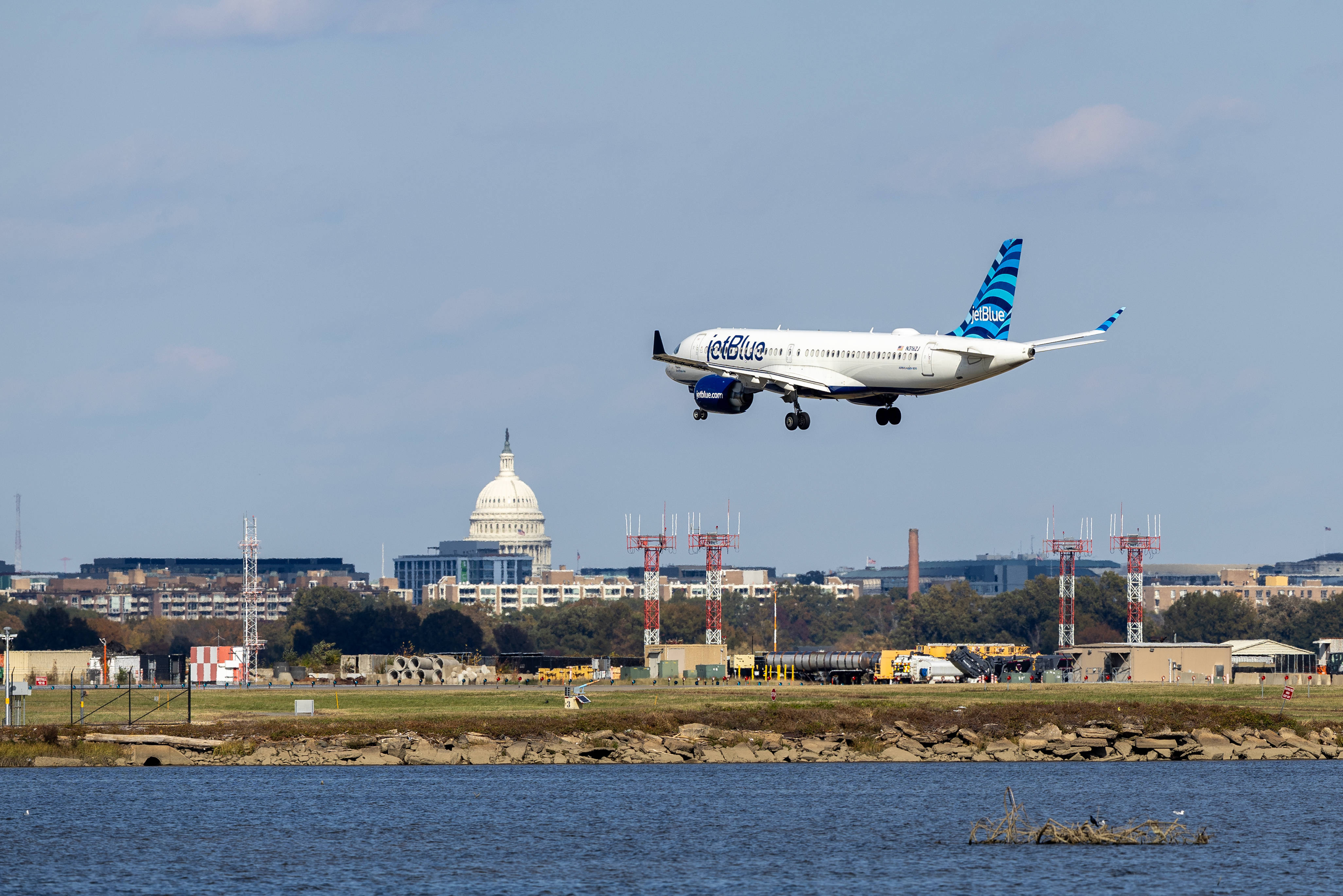 11月1日,一架飞机降落在美国弗吉尼亚州阿灵顿的里根国家机场。新华社记者胡友松摄自10月1日联邦政府“停摆”以来,作为“必要人员”的空中交通管制员被迫无薪上班,请假人员日渐增多,导致全国各地航班延误或取消情况加剧。
